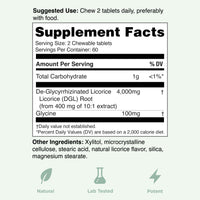 400mg per serving in a chewable format delivers the extract directly in the mouth and upper digestive tract before swallowing — relevant for a formula designed for digestive support. Deglycyrrhizination makes this dose practical for regular daily use.